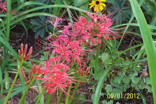 I had just posted the spider lily pictures when I was reading a really great new book called Heirloom Gardening in the South. It quotes a lady named Elizabeth Lawrence as saying the Lycoris radiata came to New Bern NC about a hundred years ago from Japan. She then tells how it moved around the South.